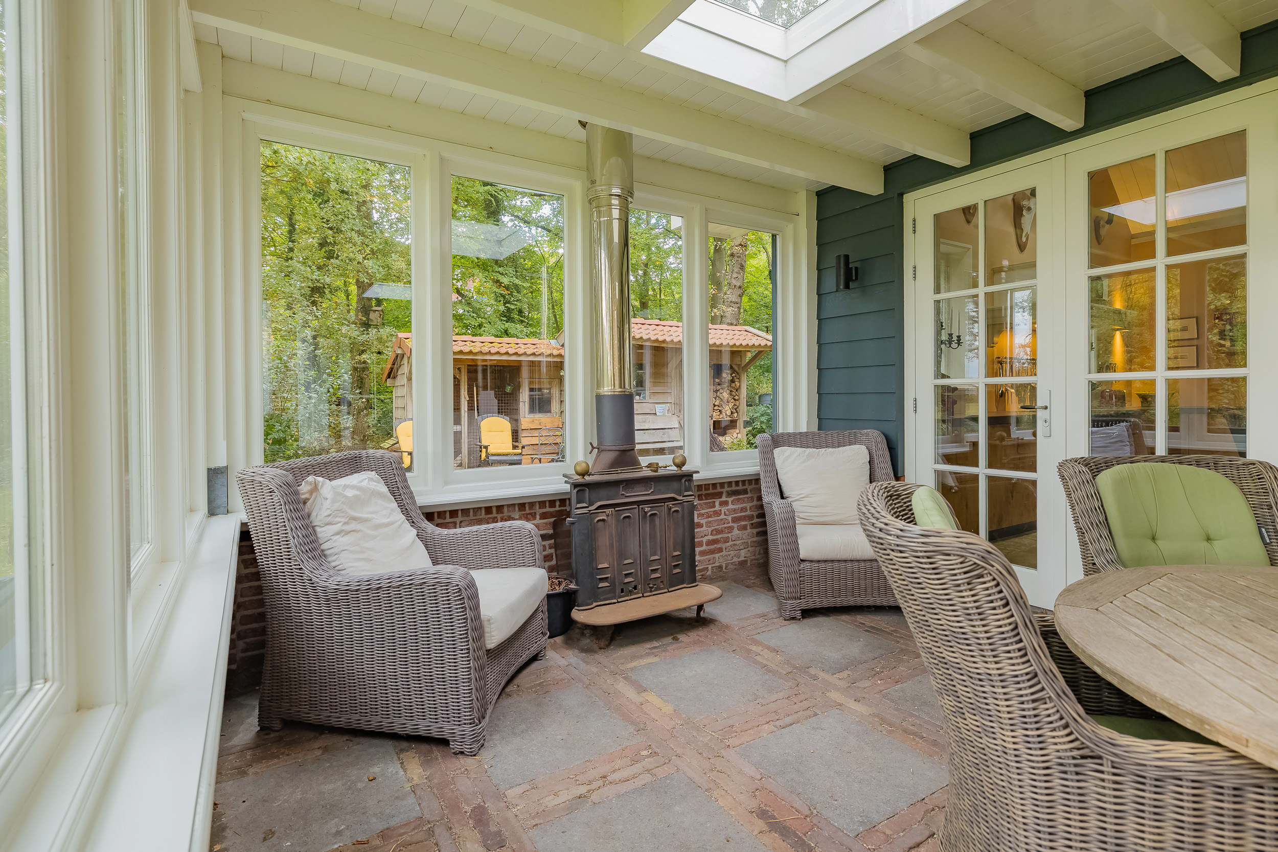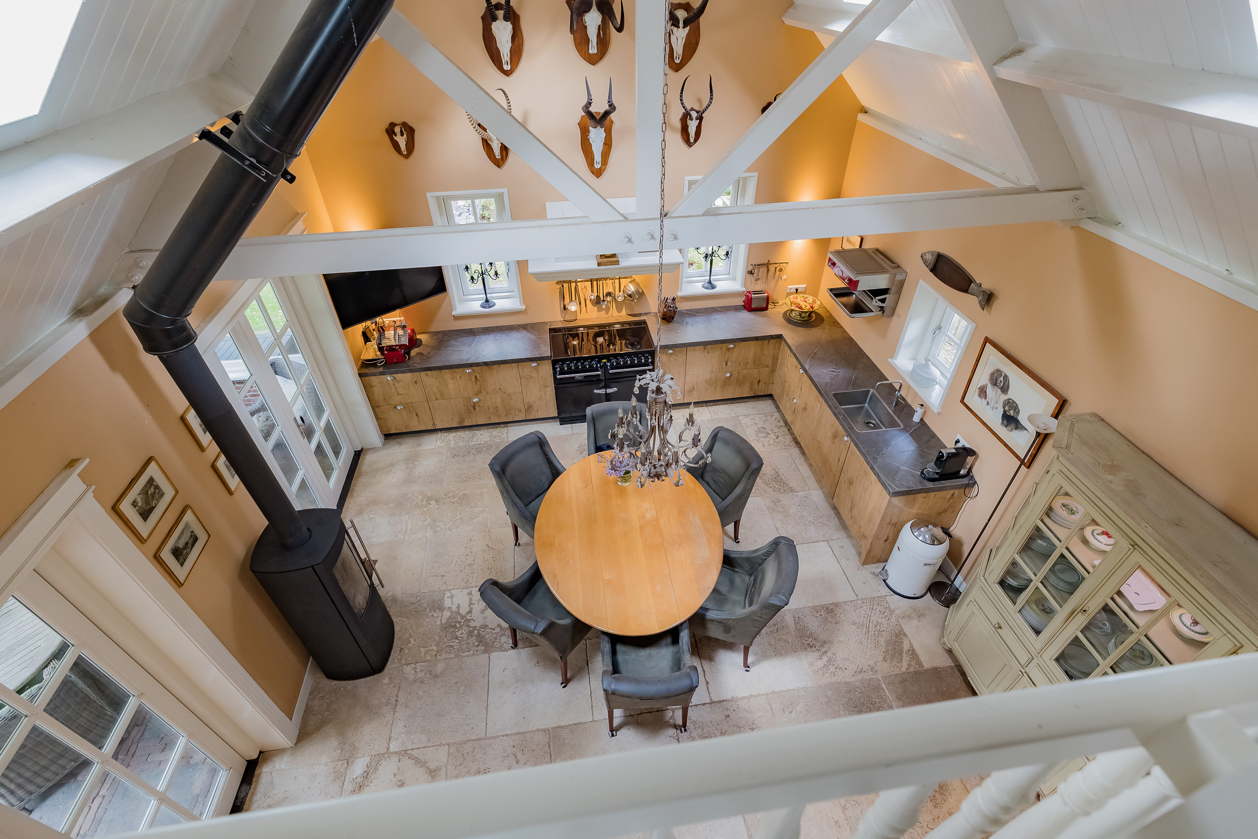 The spacious, cozy kitchen has a high ceiling, a mezzanine, modern built-in appliances including an American refrigerator and a luxury AGA induction stove with 4 ovens. Adjacent to this is a practical utility room. The skylights and wood-burning stove make the kitchen a pleasant, warm place to cook and eat. From the kitchen, you can walk straight onto the veranda, where the wood-burning stove ensures that you can enjoy the outdoors all year round.