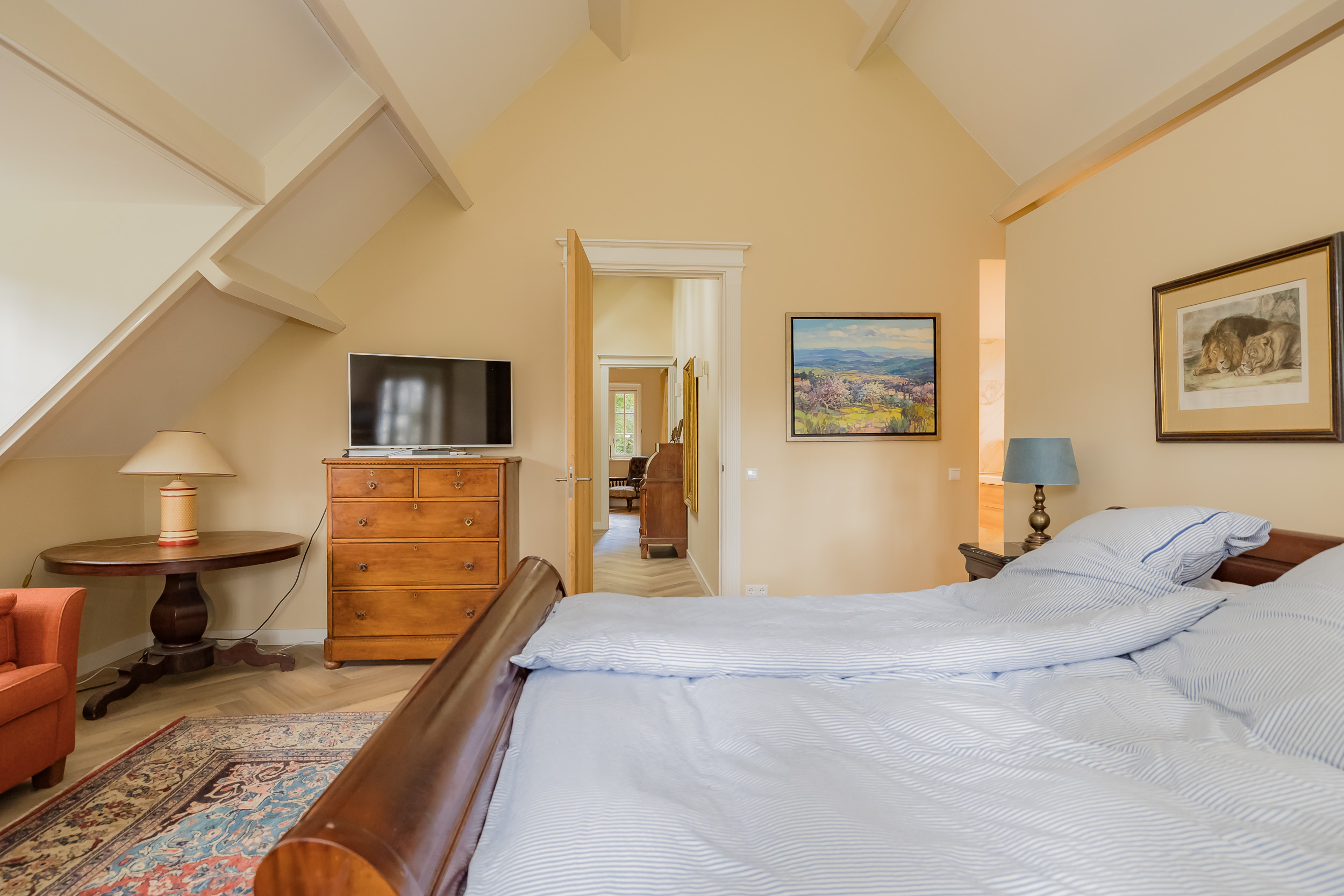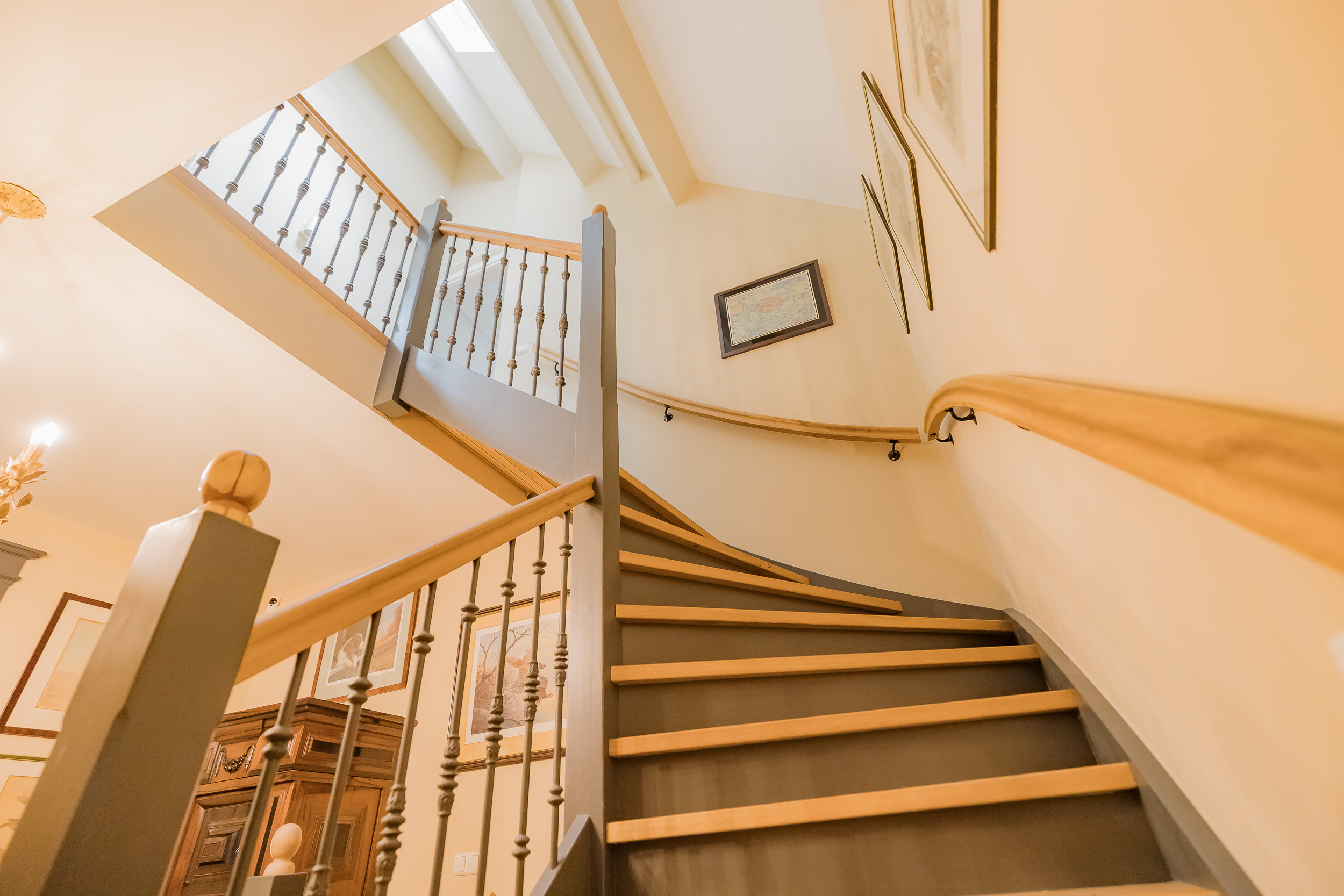 The upper floor has a spacious landing with skylights for extra light. The generous master bedroom has a cleverly placed dressing room and its own luxurious bathroom with bathtub, walk-in shower, large washbasin, toilet, and urinal. There are also two spacious bedrooms and a second bathroom, perfect for family or guests. The landing leads to the mezzanine, which can also be used as a guest room, and dormer windows on this floor provide extra space and light. There is also an attic.