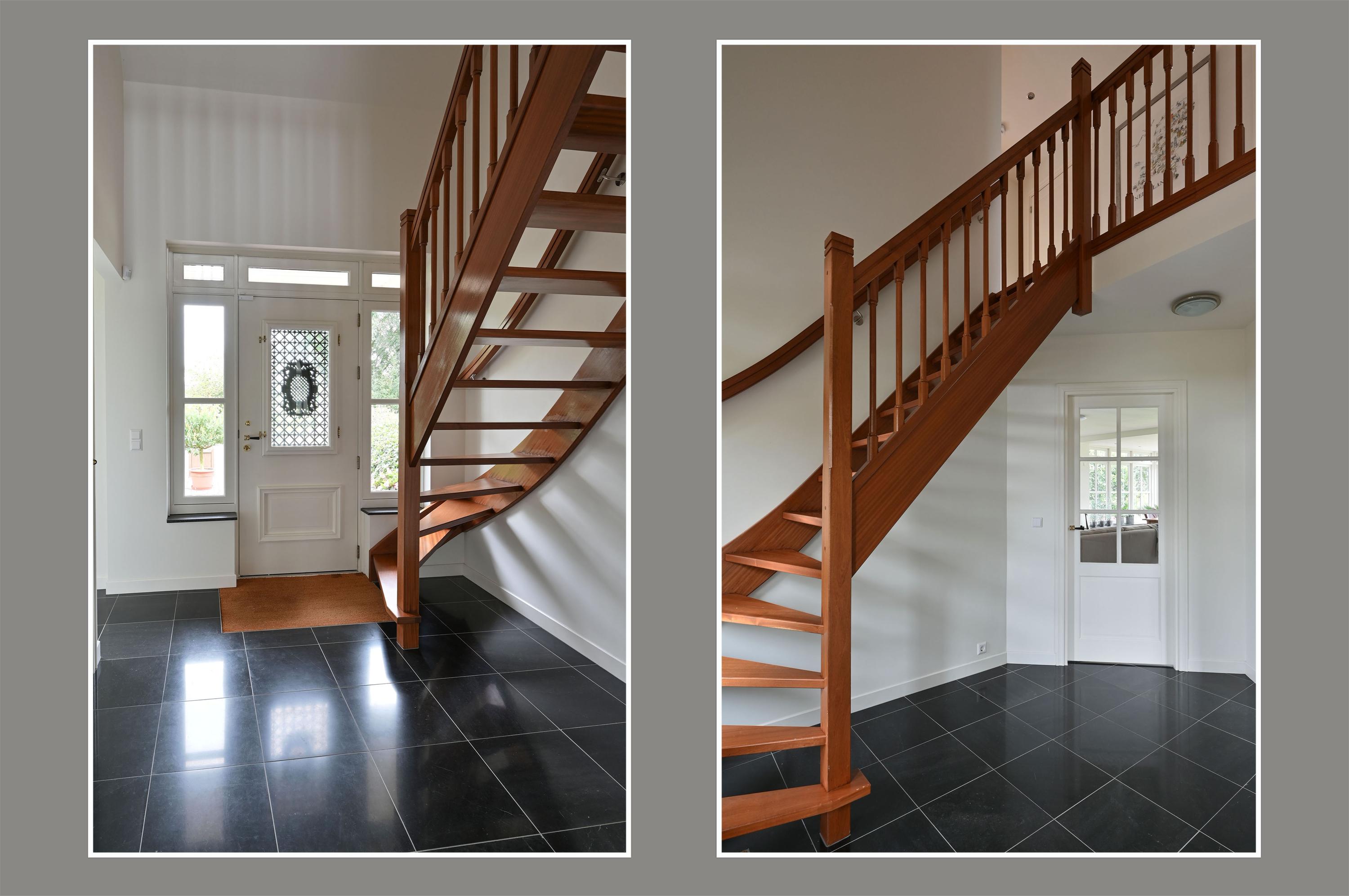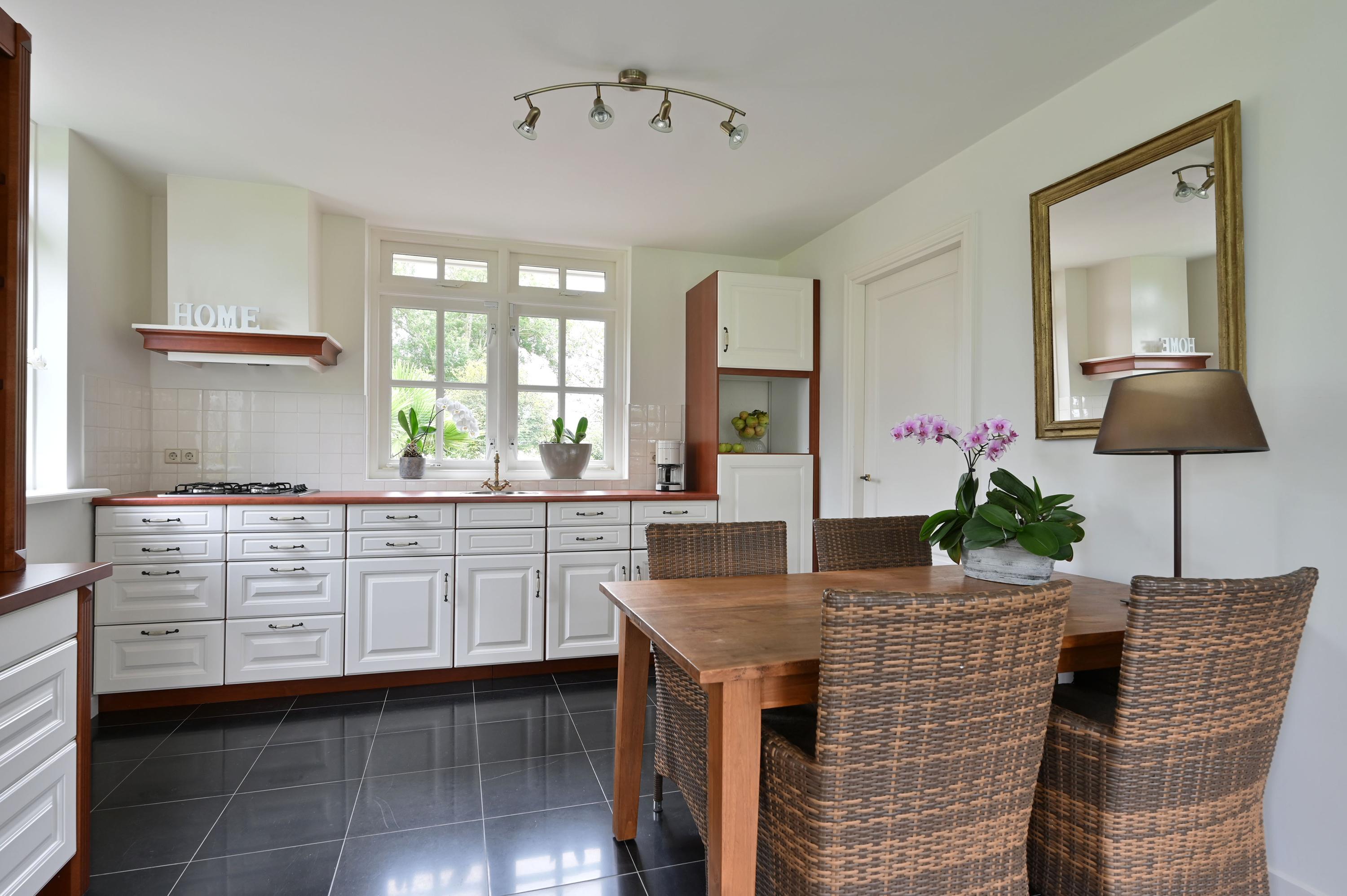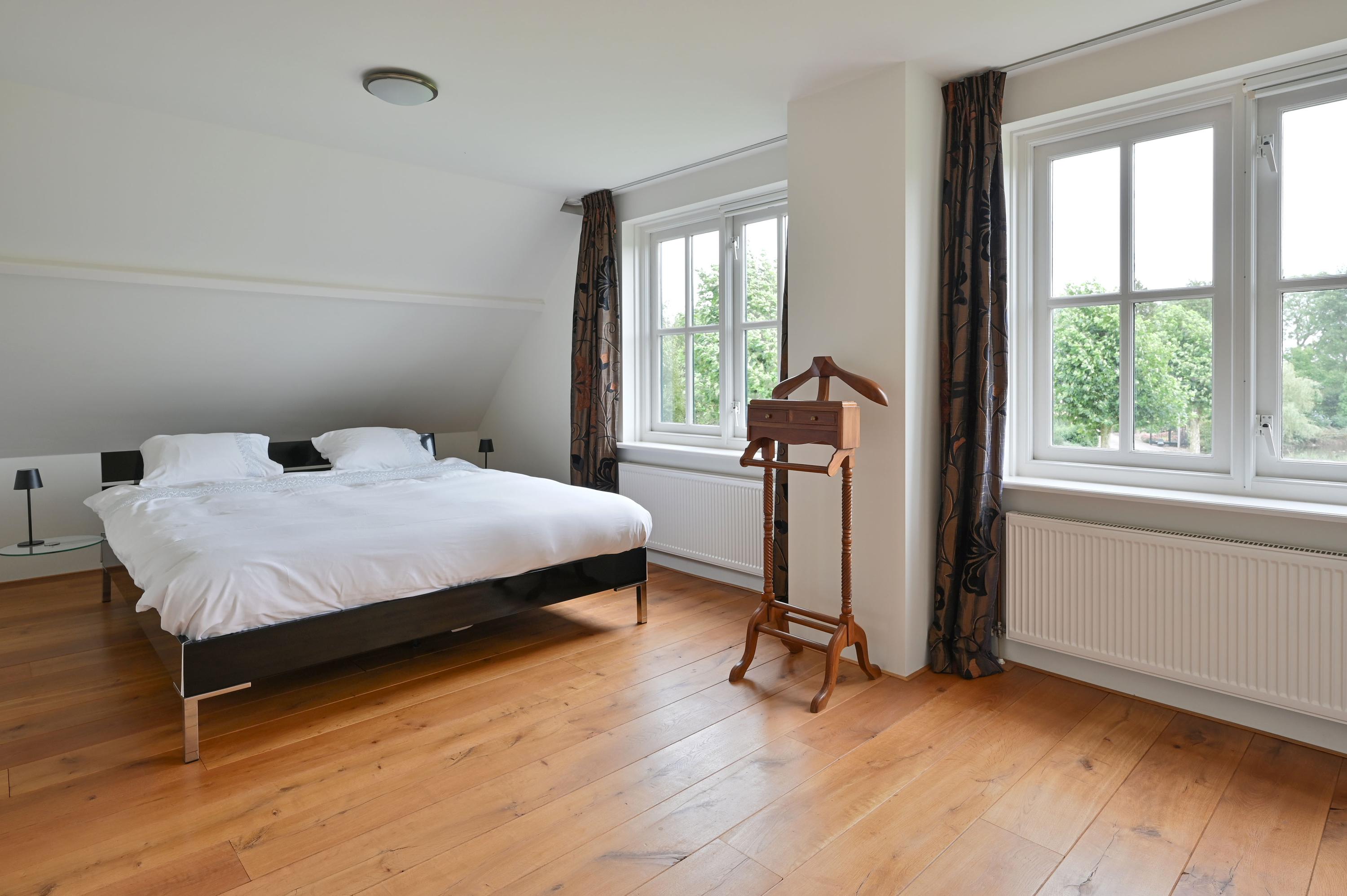Detached villa Woerdense Verlaat sits discreetly within the rural heart of the Netherlands, offering 227 m² of living space across a sweeping 46,341 m² estate. Approached by a long drive and protected by an electric gate, this detached villa opens onto thoughtfully landscaped gardens and tranquil waterfront vistas, creating a deep sense of peace and seclusion. Within the main house, a broad entrance hall and sculptural wooden staircase introduce luminous interiors, with a living room shaped by light, garden views, and the warmth of a wood stove. French doors open onto outdoor terraces that extend the sense of space. The kitchen, refined with granite surfaces and modern appliances, supports both daily rituals and convivial gatherings.