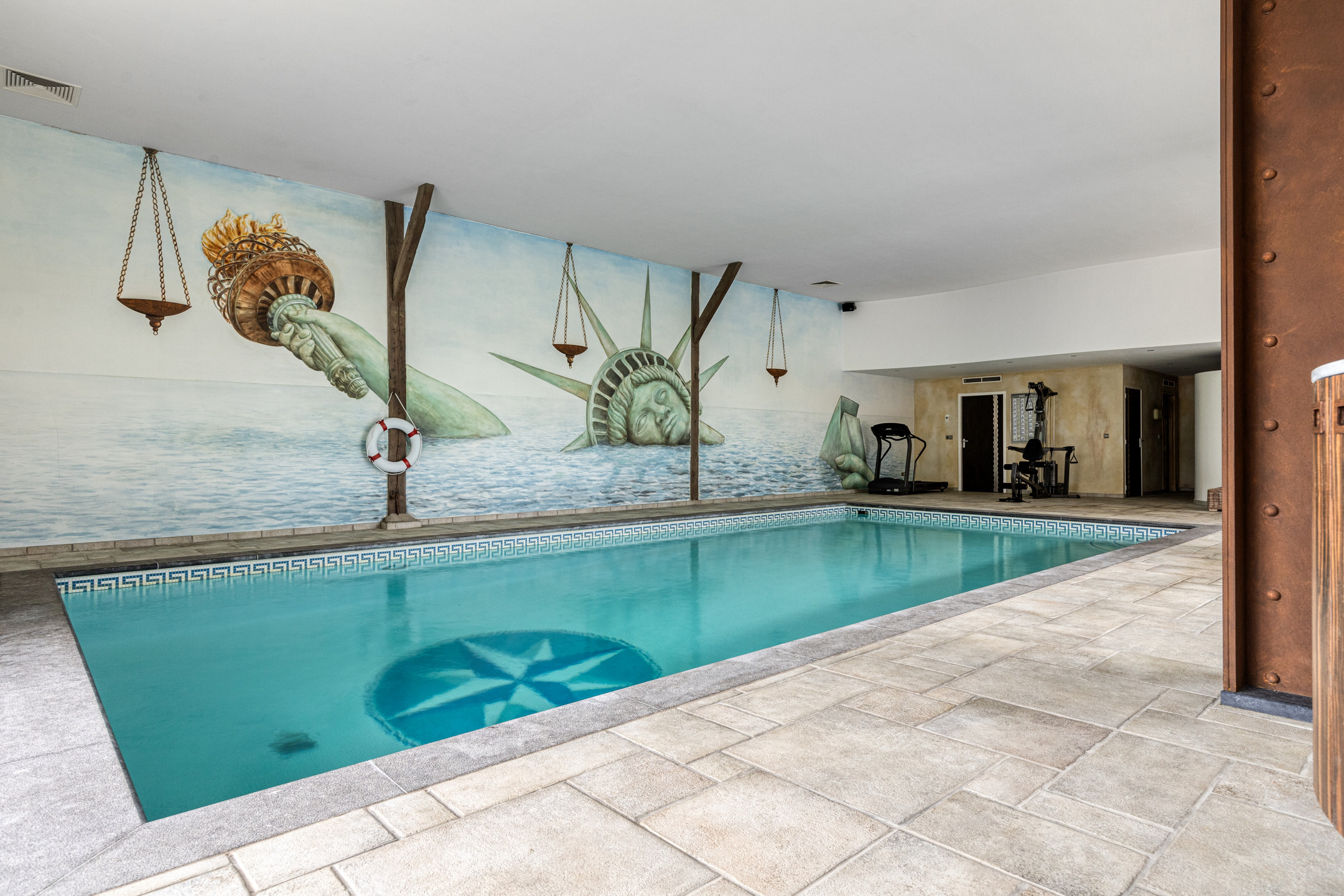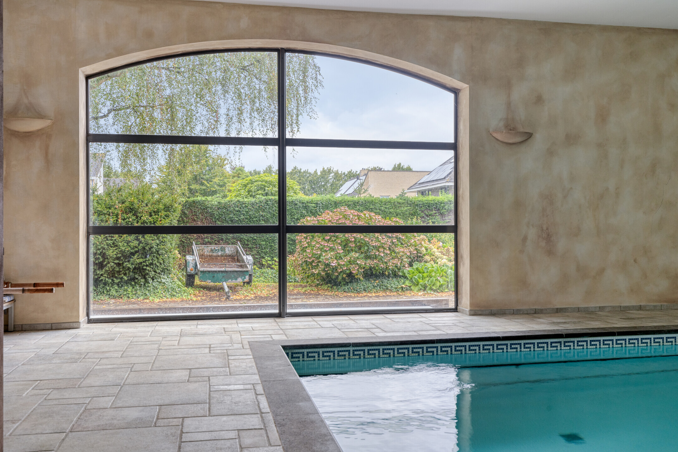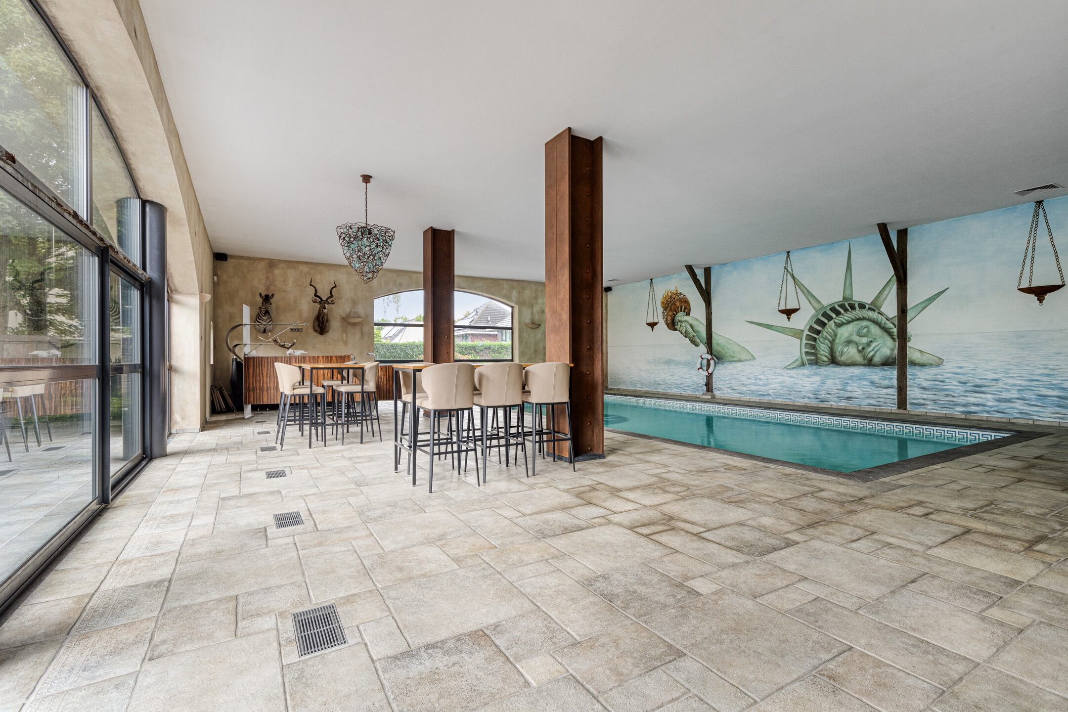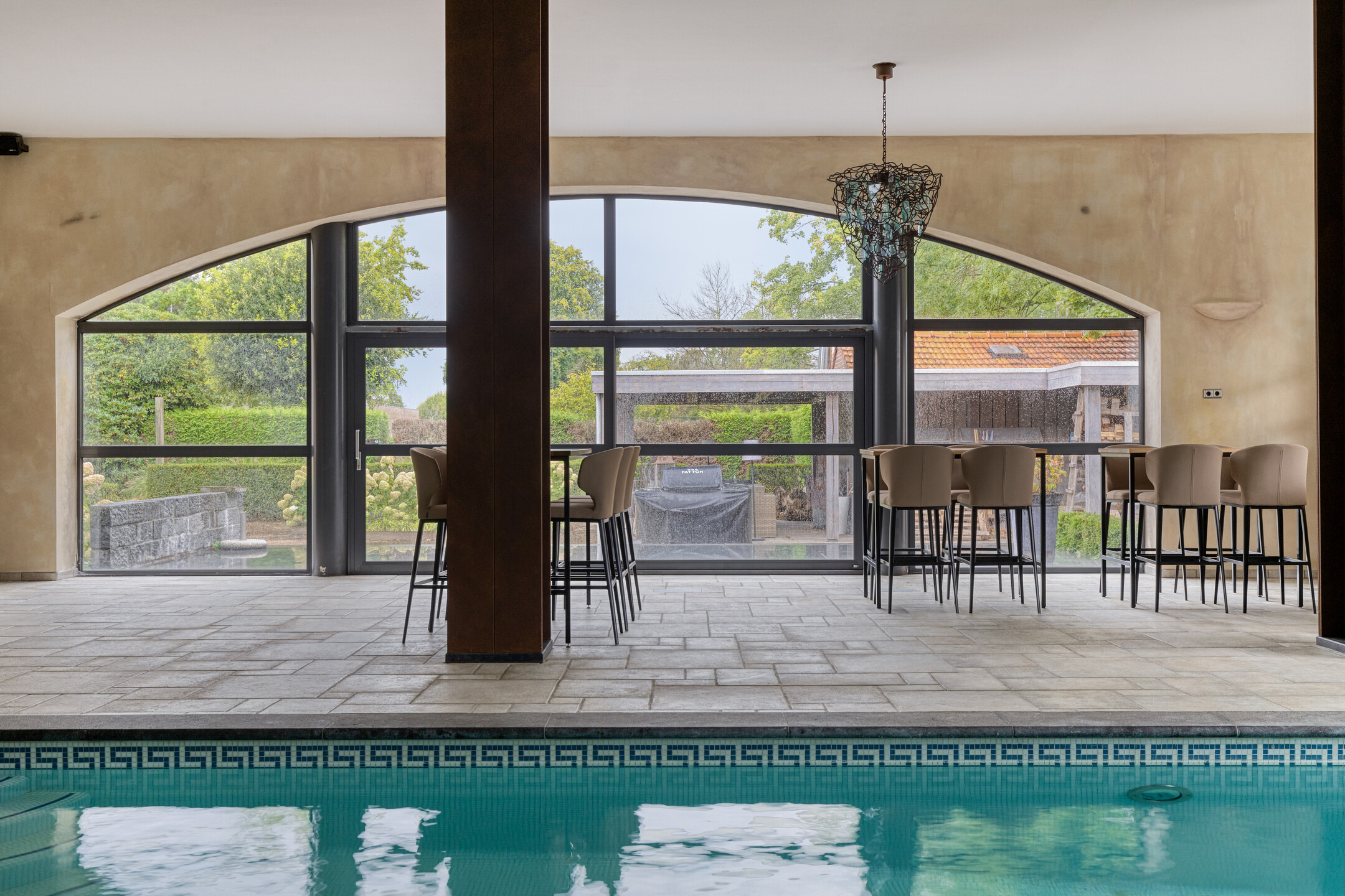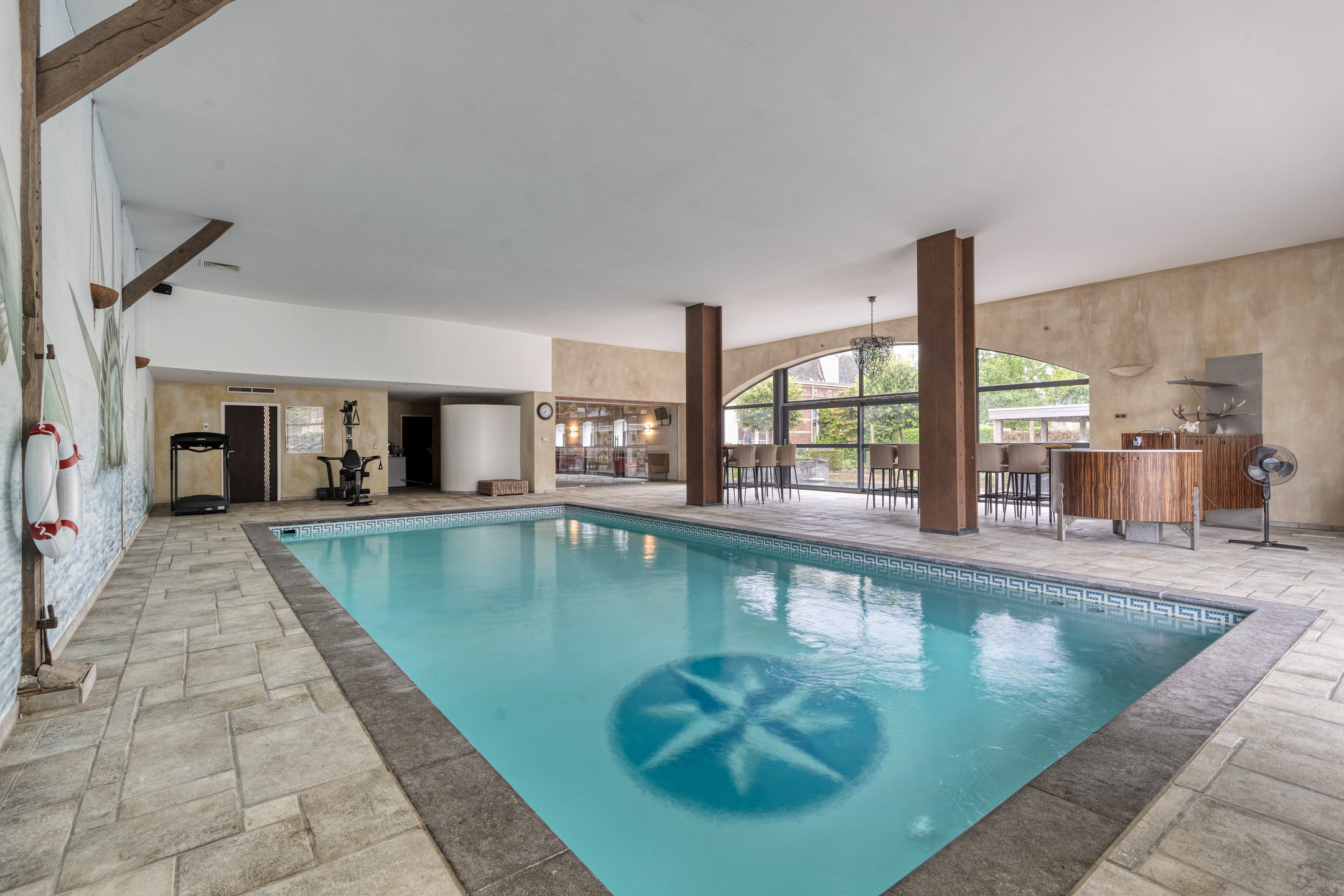 overdekt en verwarmd zwembad, (afm. ca. 10 x 5 meter, diepte van ca. 1,20 tot 2 meter), wandafwerking schuurwerk met een tegelvloer, plafond afgewerkt met stucwerk, schuifpui naar tuin/terras;