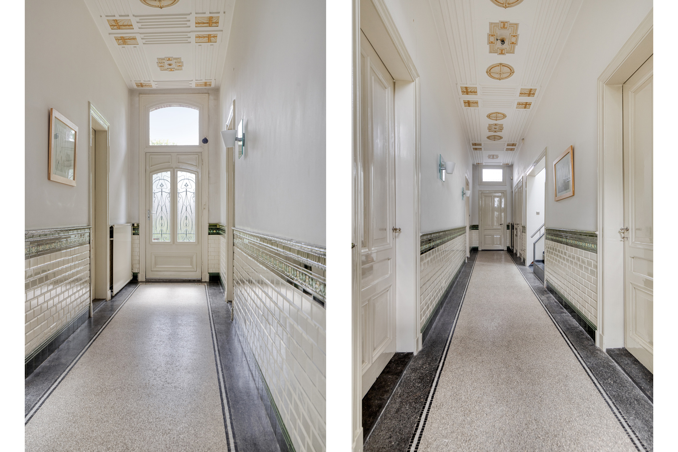 Entree, wandafwerking stucwerk, tegelvloer, gewelvenplafond;
