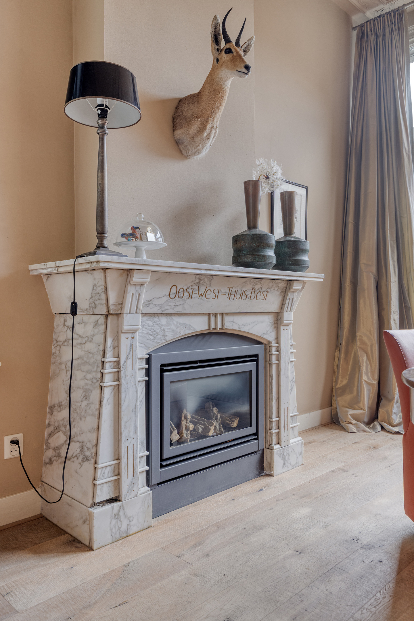 imposante woonkamer en-suite (ca. 50 m²) voorzien van glas-in-lood deuren, inbouwkasten en dubbele marmeren schouwpartijen met een inbouw gashaard en inbouw houtkachel, wandafwerking stucwerk, eiken planken vloer, prachtig authentiek plafond voorzien van sierlijsten en ornamenten;