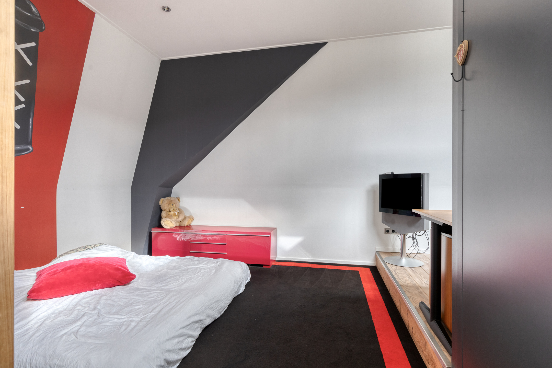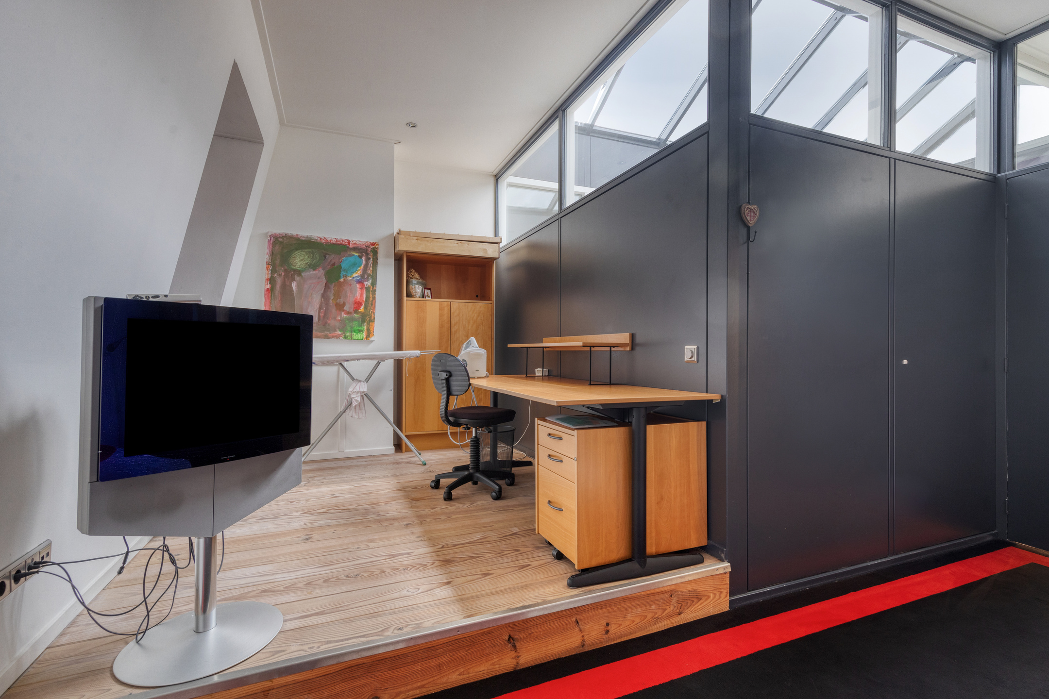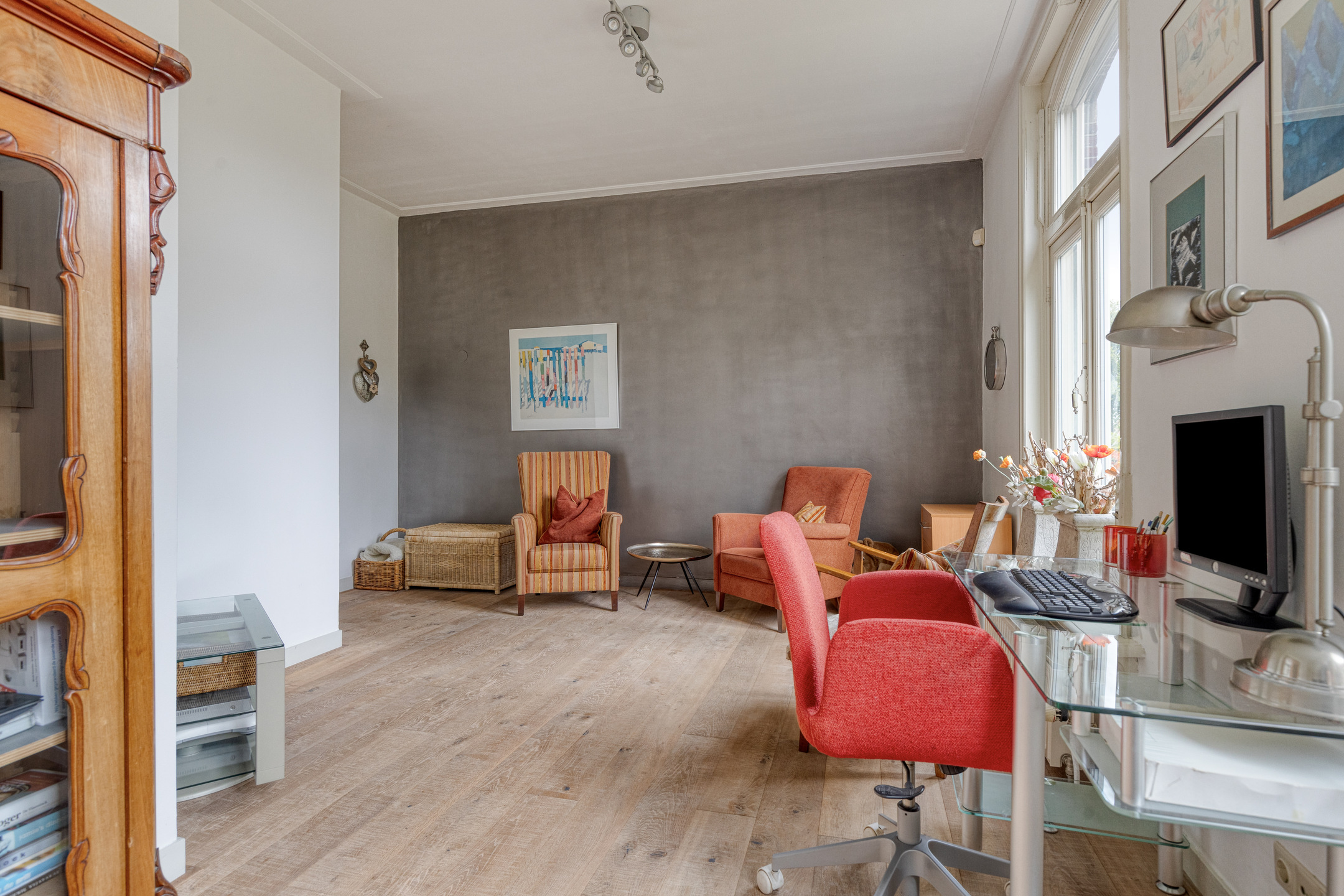 speel/TV/opkamer met een kastenwand, wandafwerking stucwerk, eiken planken vloer, plafond afgewerkt met stucwerk;