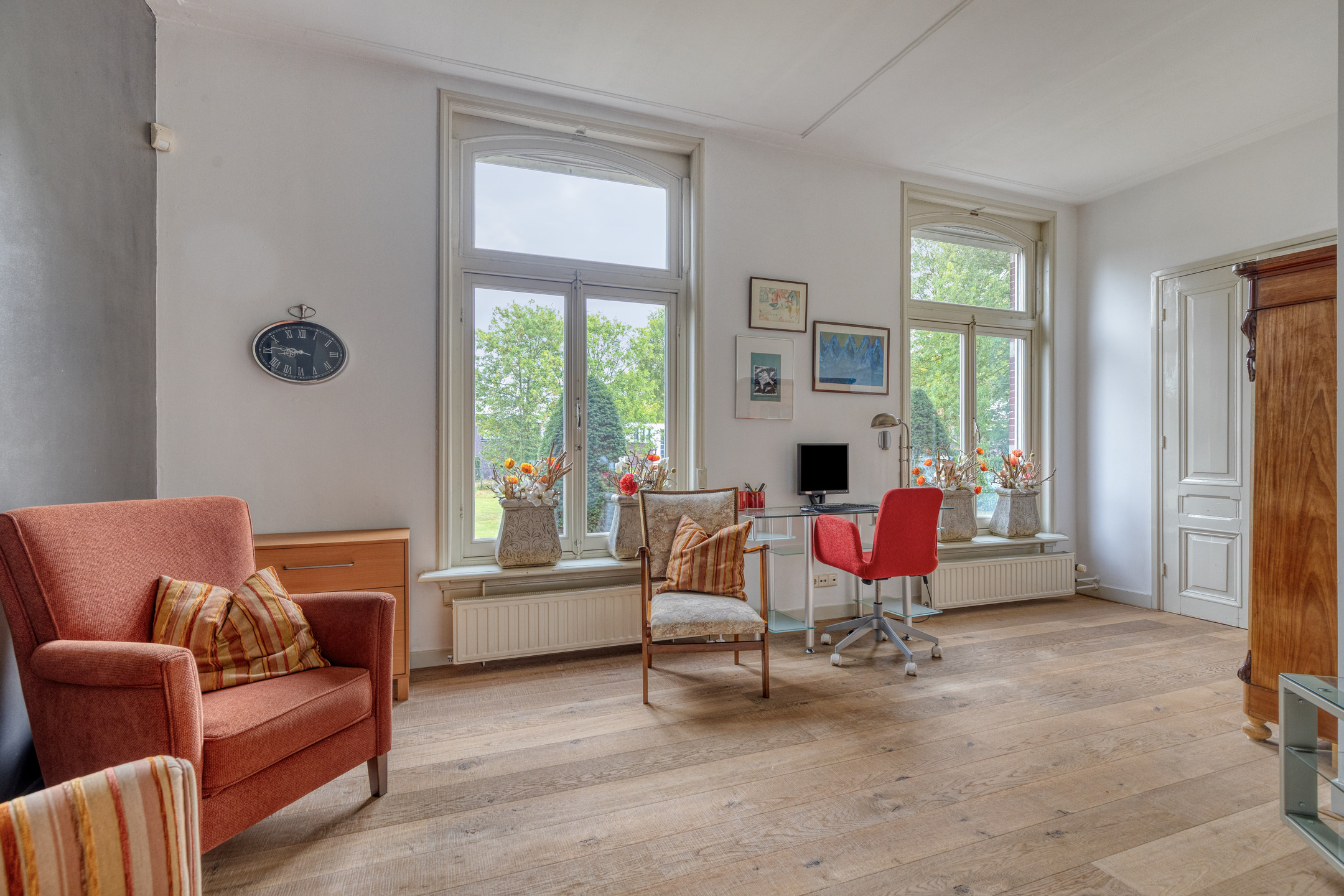 werkkamer (ca. 18 m²) met een schouwpartij, wandafwerking stucwerk, parketvloer, authentiek plafond;