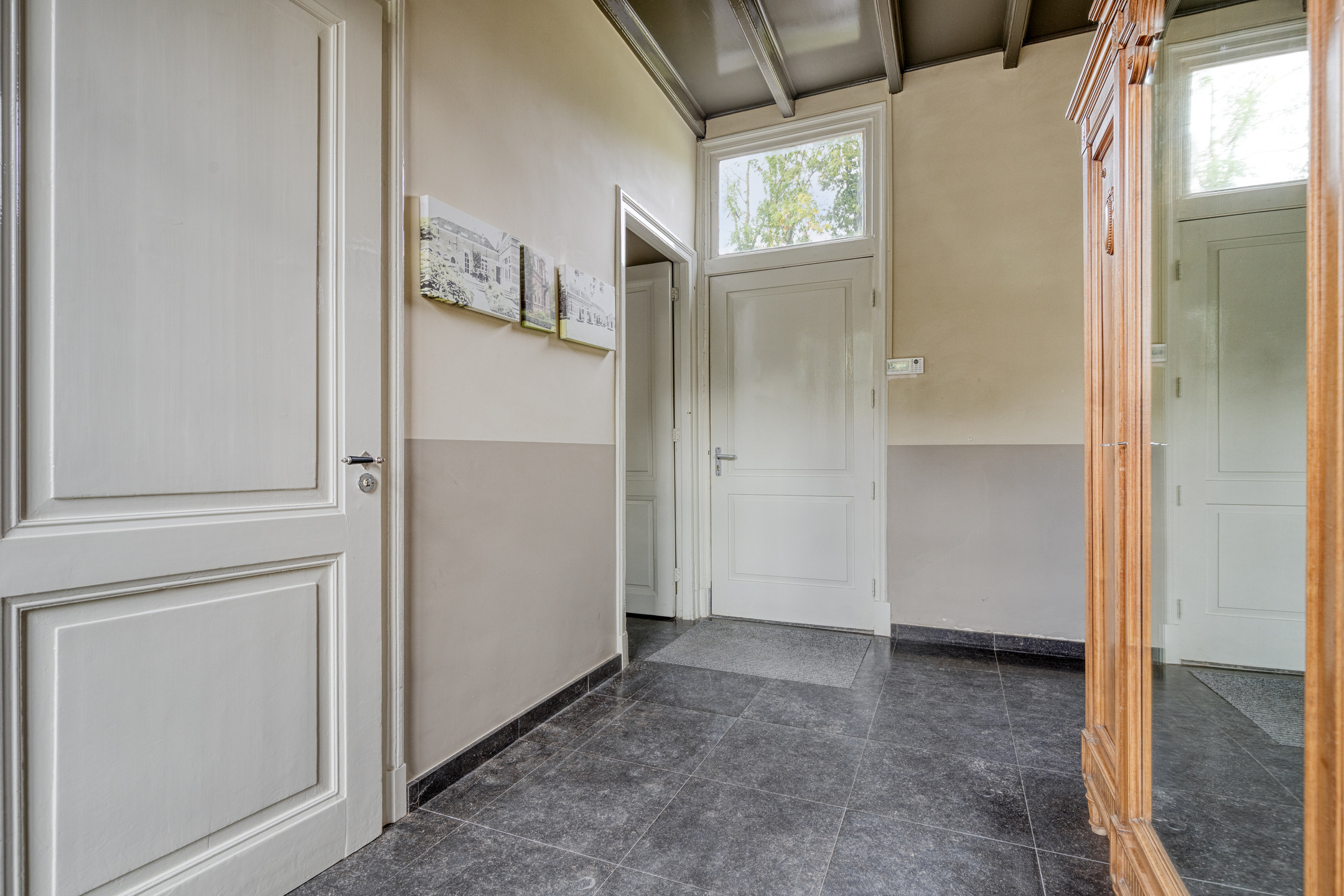 achter portaal, wandafwerking stucwerk, hardstenen vloer, balkenplafond;