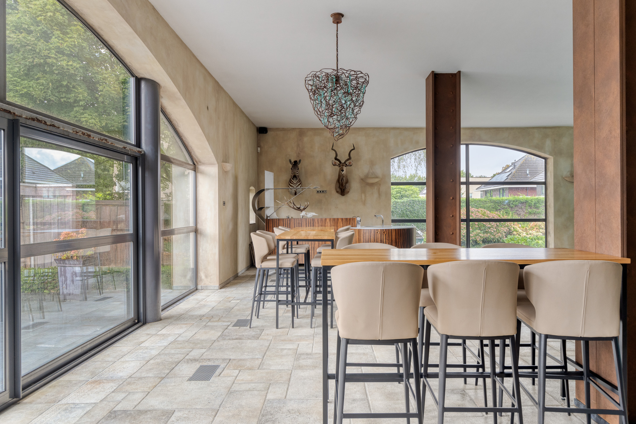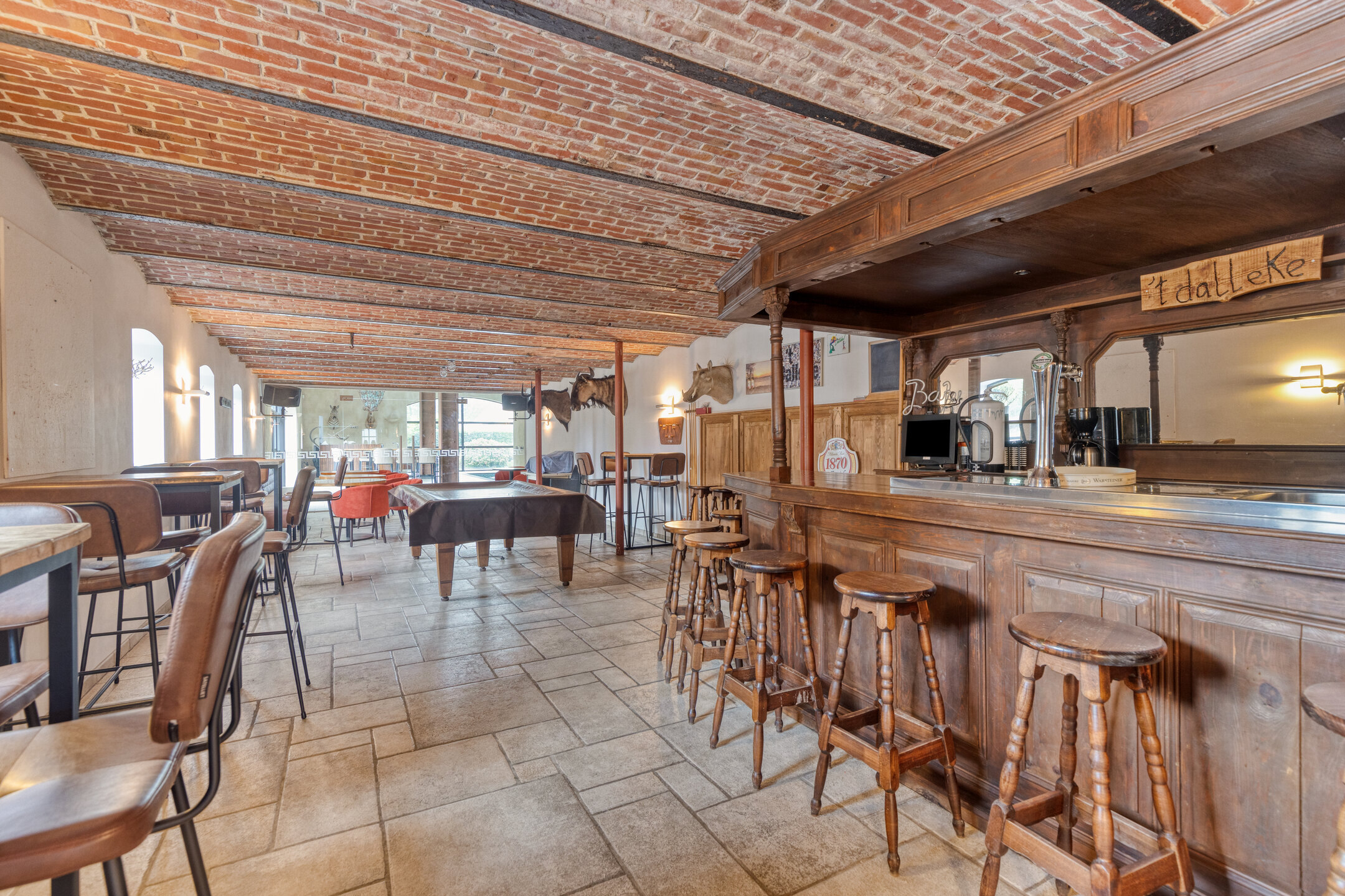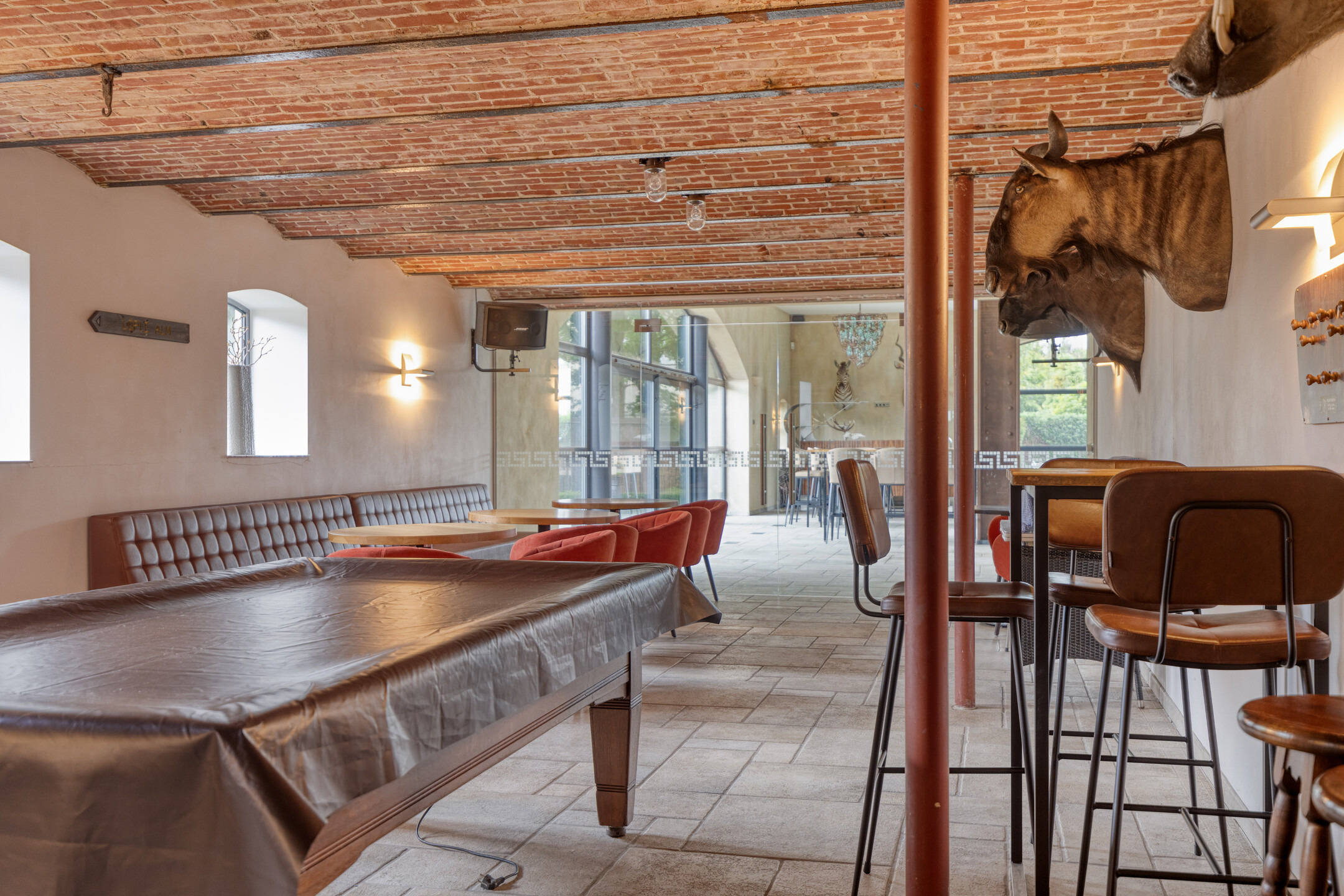 ontspanningsruimte met een complete barinrichting, wandafwerking stucwerk, tegelvloer, gewelvenplafond;