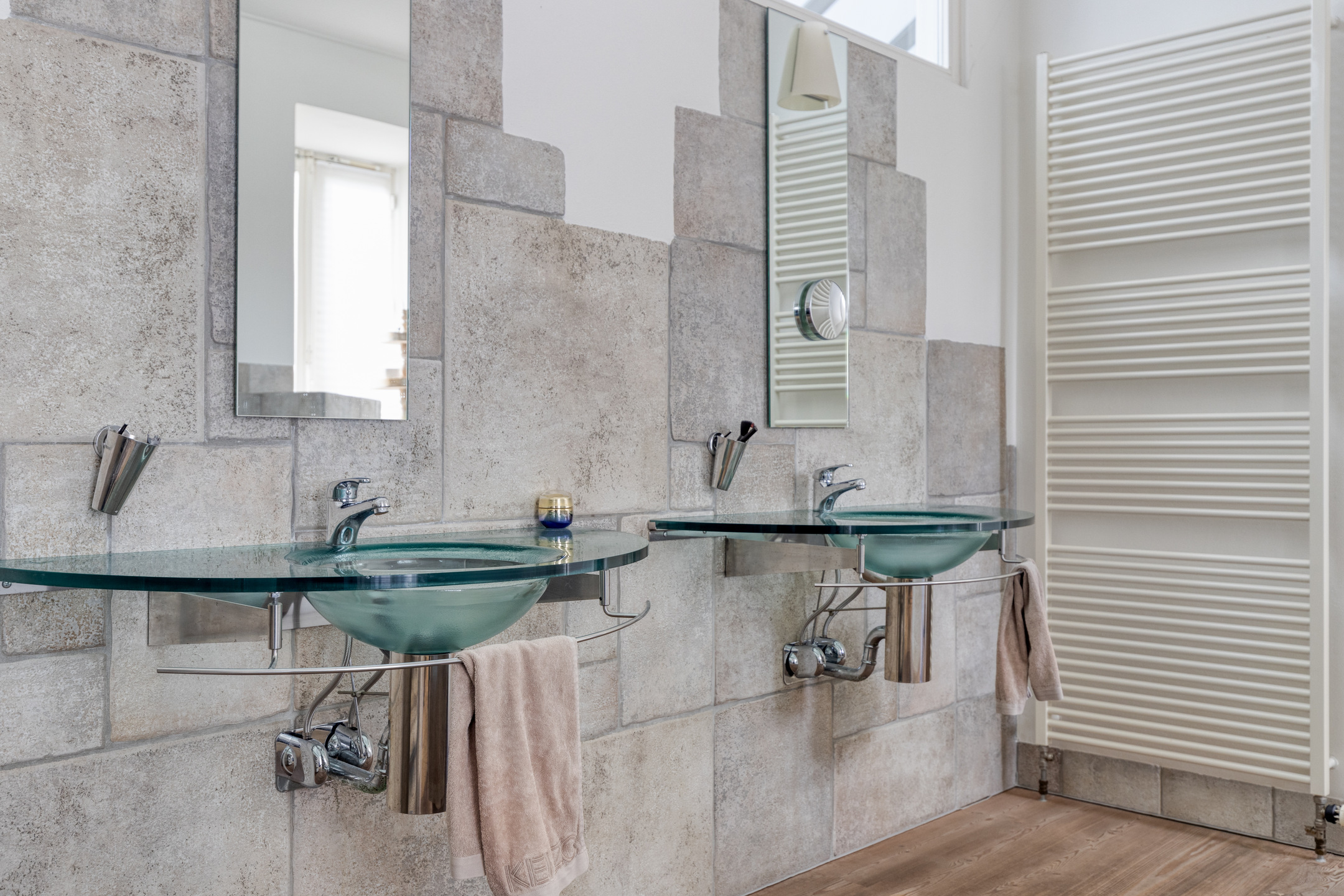 betegelde badkamer, voorzien van een badkamermeubel met dubbele wastafel, wandcloset, inloopdouche en designradiator.