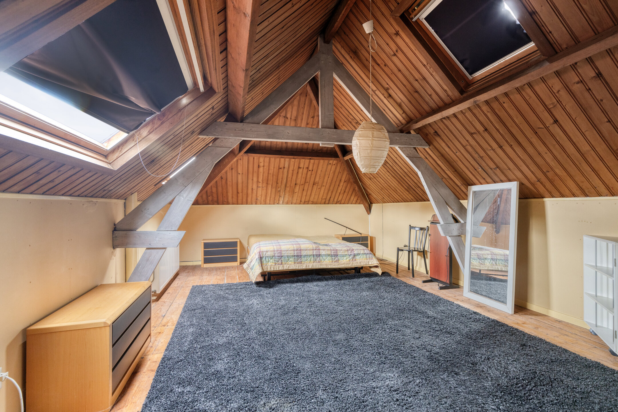 Logeerruimte (ca. 25 m²) met 4 Velux dakramen, houten vloer, dakbeschot in het zicht;