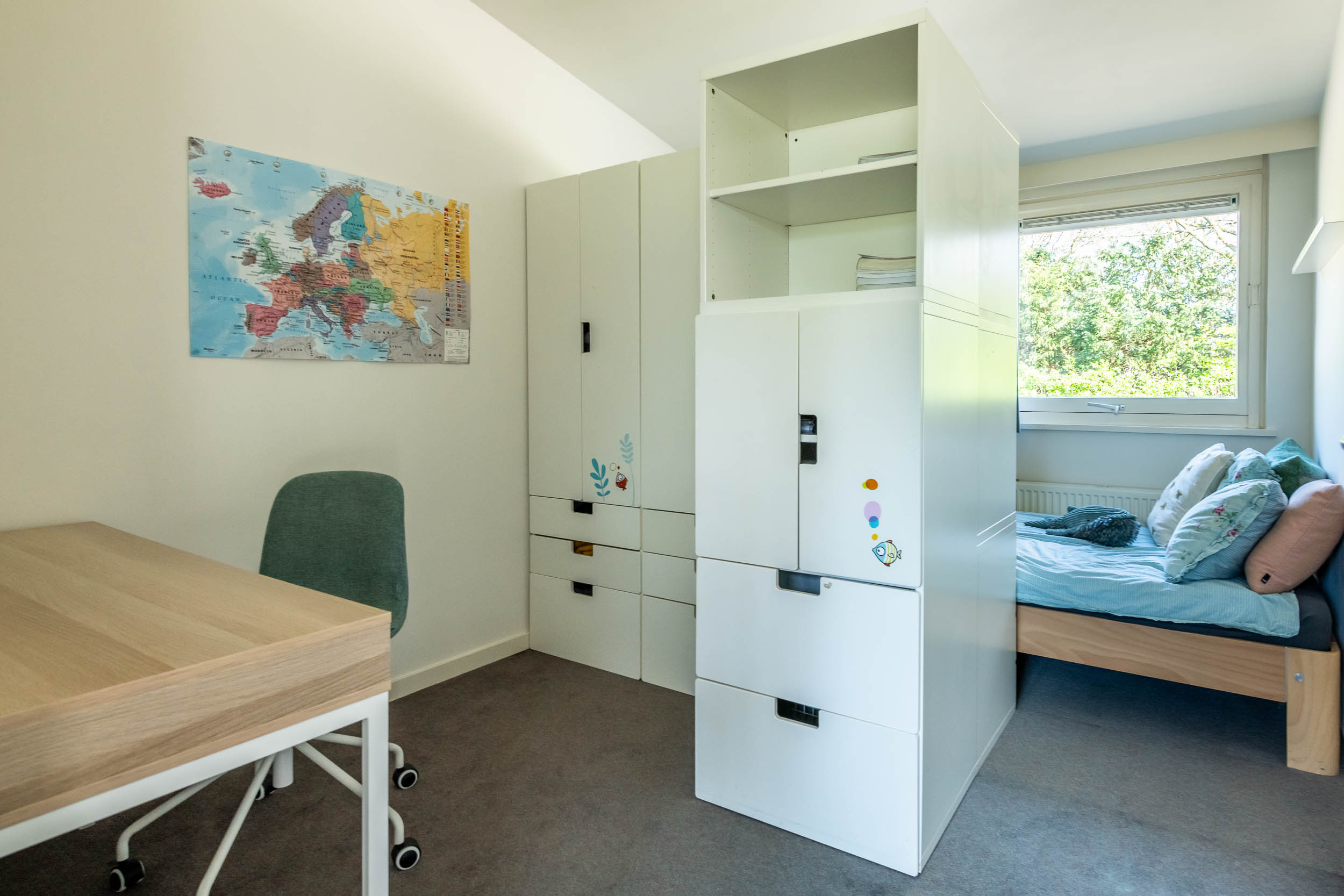 The home is approached by a long driveway with plentiful parking and features an airy living room, illuminated by large windows and two sliding doors, opening onto a sunny terrace with sweeping views of the surrounding dune garden. The wood burning stove, underfloor heating, and careful insulation including double glazing and facade insulation contribute to year round comfort, reflected in its energy class C status.