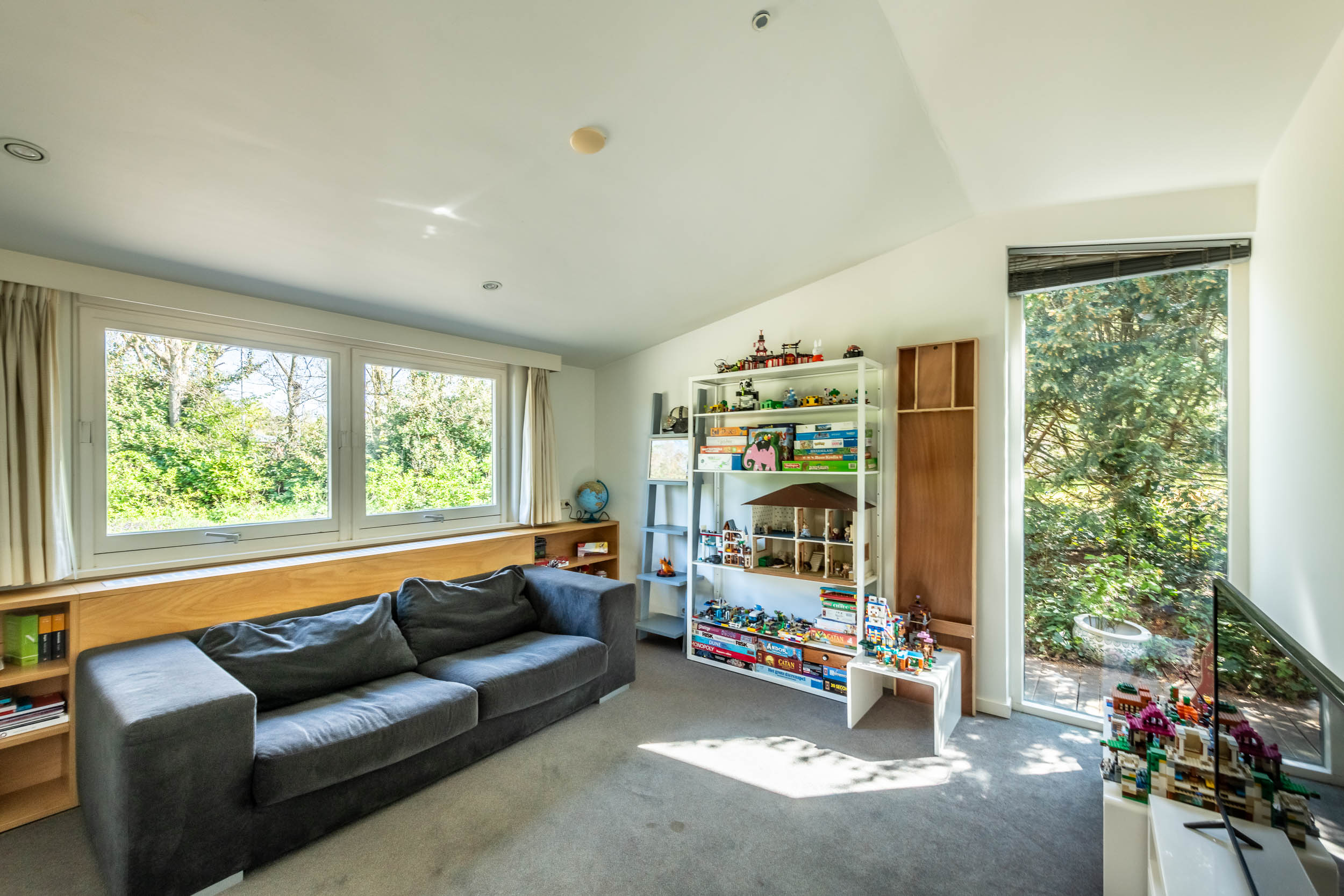 There are two distinct bedroom wings, supporting privacy for family living or guests. The basement features a large multifunctional space with outdoor access, ideal for a studio or guest suite. A utility room, attached garage, and thoughtful spatial arrangement enhance daily ease. The low maintenance garden, with its own well and water pump, can be enjoyed indoors or out.