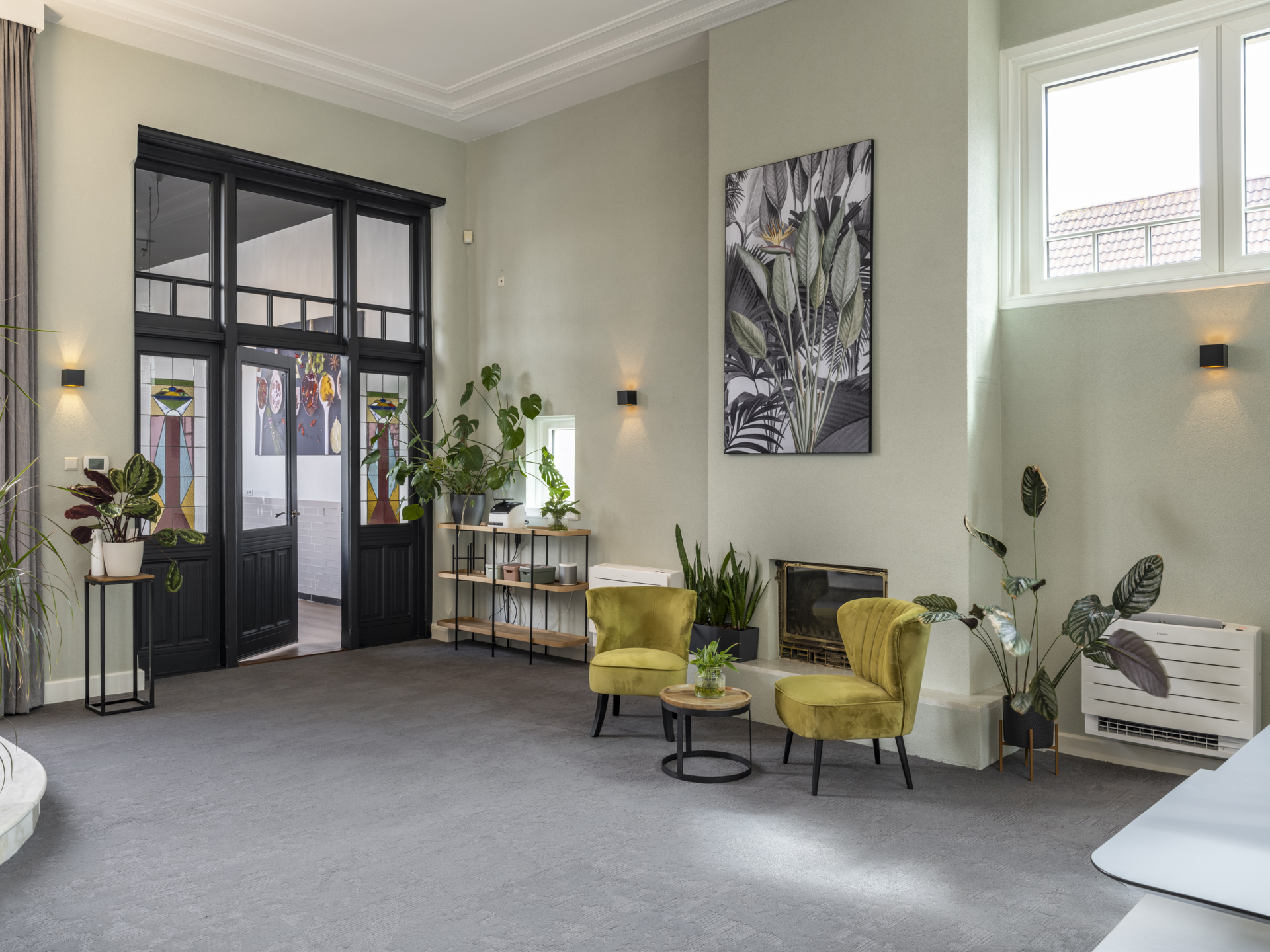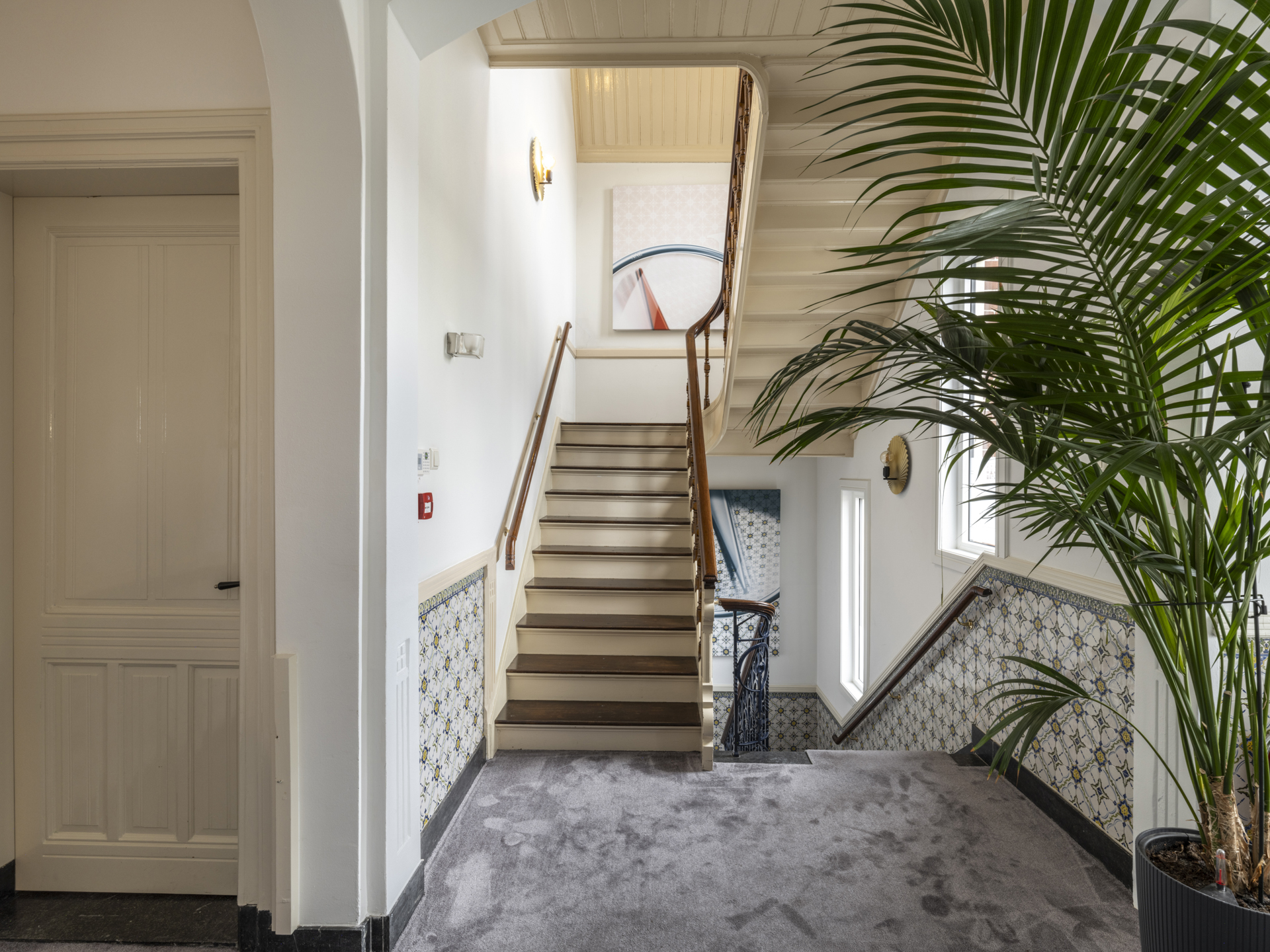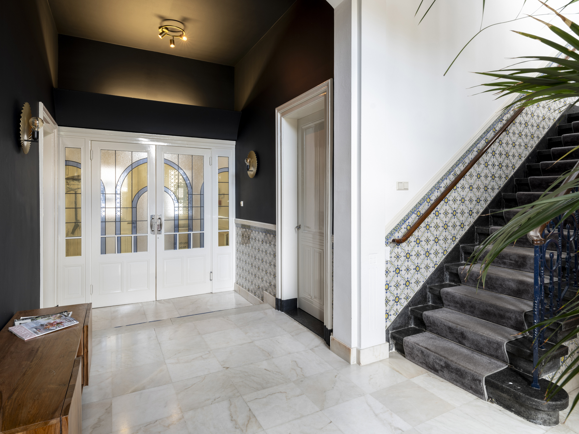 Period elements such as an original hardstone staircase, marble floors, intricate plasterwork, and leaded glass appear throughout. The flow of the home is anchored by a dramatic central hallway, with distinct living and working rooms branching off. Carefully updated, the villa marries heritage with modern comfort: high-grade insulation, HR++ double glazing, 23 solar panels, and three heating systems.